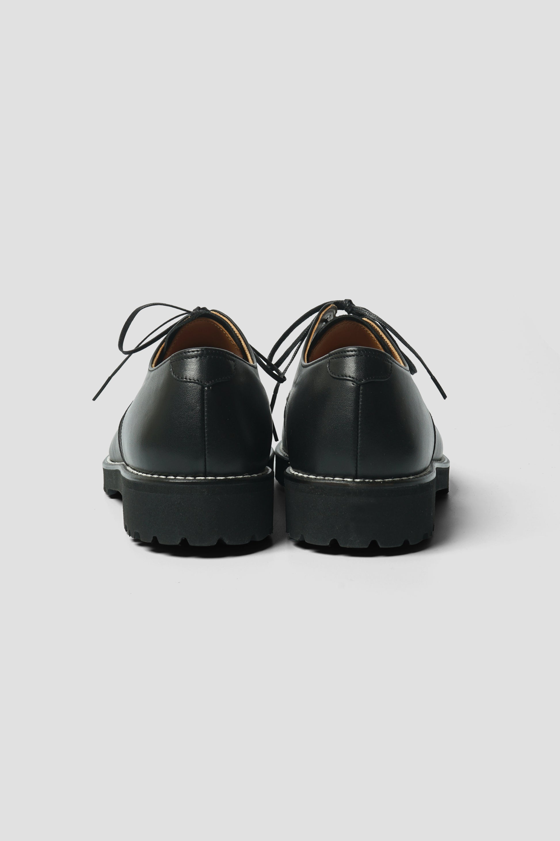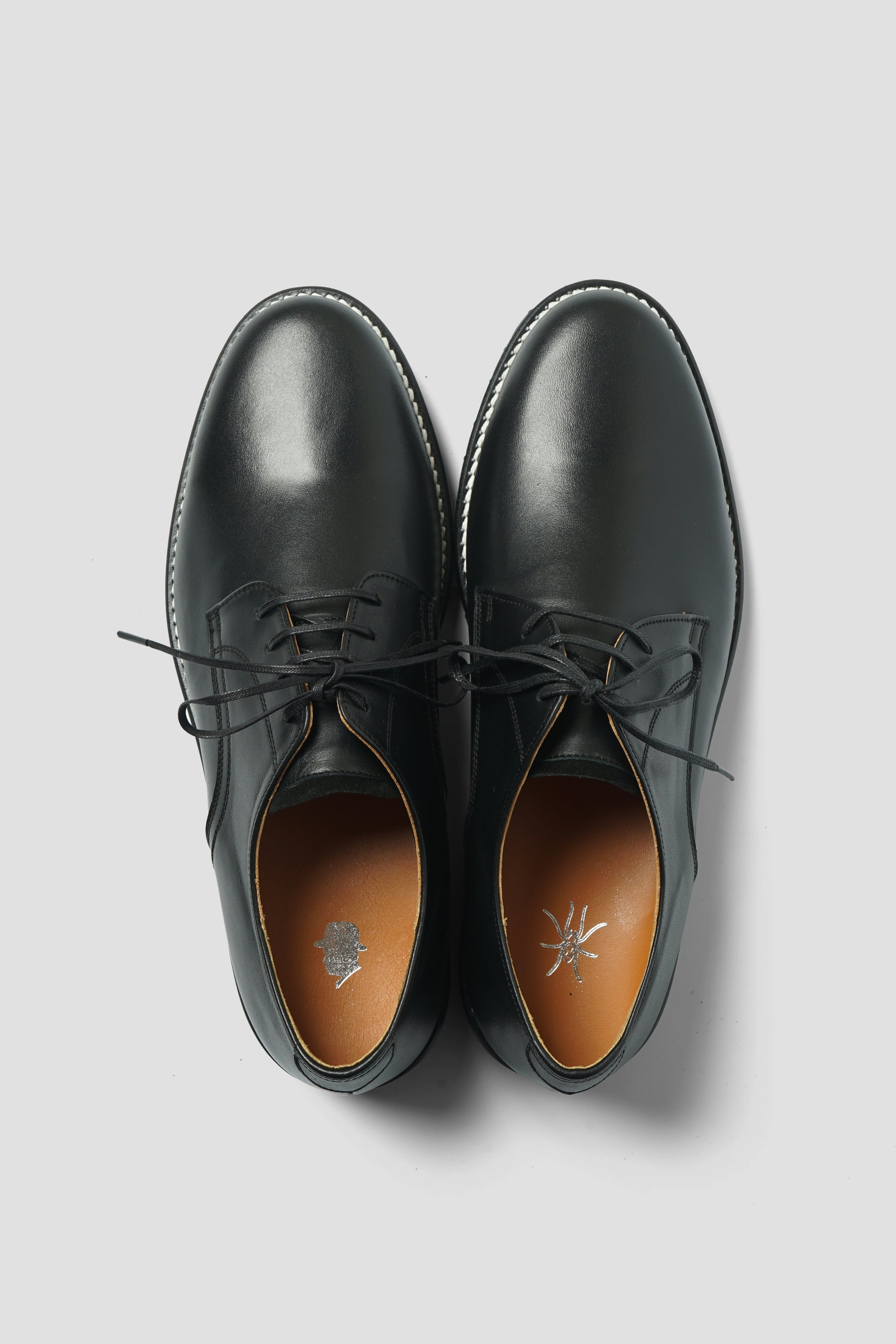 左右非対称の外羽根のデザインのミリタリーサービスシューズモチーフのレザーシューズ。足馴染みが良い良い柔らかいスムースレザーを使用しています。Vibram社製EVAタンクソール使用。